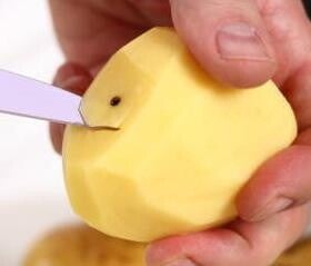 Dat maakt niet uit, als alle stukken maar ongeveer even groot zijn. Zo zijn alle aardappelen straks tegelijk even gaar. Verwijder zeker ook de 'ogen': dat zijn de donkere plekjes waar de eventuele uitlopers of scheuten van de aardappel hebben gezeten.
