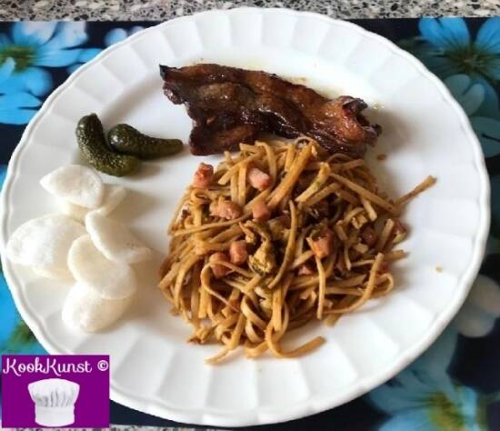 Om het af te maken kun je op de bami nog een plak ham en een gebakken ei leggen.