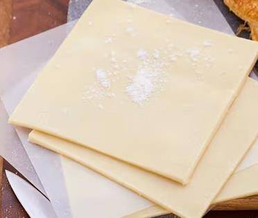 Leg dan de andere plak bladerdeeg er op. Druk de zijkanten een beetje aan op de onderste rand.