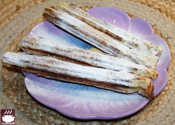 Frituurolie verhitten tot ca 185 graden. Deeg in spuitzak scheppen en in gedeelten slierten van ca 10 cm in olie spuiten en ca. 4 min. goudbruin frituren. Laten uitlekken op keukenpapier en flink bestrooien met poedersuiker.