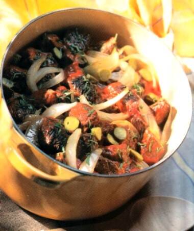 Met deksel op pan, vlees op zacht vuur in ca. 4½ uur gaar laten worden.