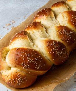 Druk de uiteinden van 3 slangen op elkaar en vlecht tot een mooi brood (Volgens Joods gebruik 2 broden met elk 6 vlechtknopen voor de 12 stammen van Israël)