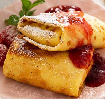 Verdeel nu de zoete kaasvulling over elke blintz en rol ze op als een burrito. Voeg een el ongezouten boter toe aan een koekenpan en breng het vuur middelhoog. Bak vervolgens de afgewerkte blintz aan elke kant lichtbruin.