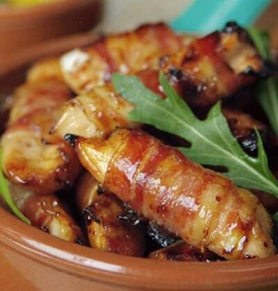 Snijd de speklapjes elk in 6 stukjes en meng ze met wat marinade. Laat het vlees afgedekt een tijdje in de koelkast rusten.