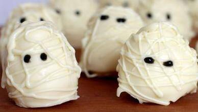 Smelt ondertussen de witte chocoladesdruppels in een hittebestendige kom boven een pan met kokend water.Haal de truffelballetjes uit de vriezer. Doop de balletjes een voor een in de gesmolten chocolade, zodat het overtollige materiaal eraf kan druipen. Leg het op een bakplaat bekleed met bakpapier.