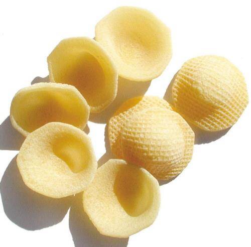 Caccavella: de grootste pasta ter wereld! Eén schelp weegt 50 gram en heeft een diameter van 9 cm. Serveer er eentje als voorgerecht, gevuld met tomatensaus, mozzarella, gehakt en ricotta.