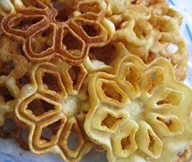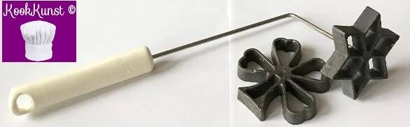Met deze tang maak je knapperige wafels. Eerst in de hete olie dopen, dan in je beslag en dan frituren. Ik heb twee vormpjes, een ster en een bloem. Zo oud als de weg naar Rome, maar het werkt nog steeds. Meestal met oud en nieuw serveer ik ze bij de oliebollen. Lekker knapperig. Serveren met poedersuiker. Wel dezelfde dag opeten!