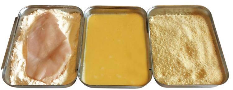 Handig afneembare bakjes om je schnitzels te paneren. Eerste bakje met bloem, tweede bakje met geklutst ei en het derde bakje met paneermeel.