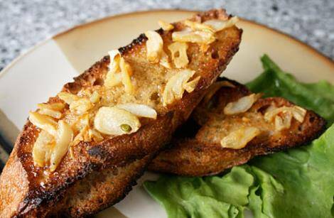 Geroosterde plakjes stokbrood met peper paté besmeren en met gebakken champignons beleggen.