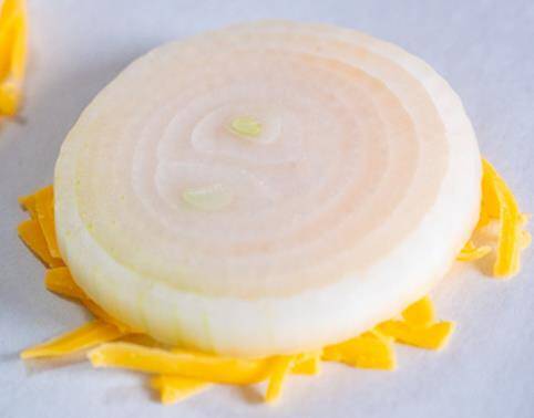 Snijd de uien in zeer dunne rondjes en gooi de buitenste schil weg. Het zouden ca. 16 rondjes moeten worden. Schik 8 stapels cheddarkaas op elke bakplaat. Druk een ui rond op elke stapel en bestrooi met ranchkruiden.