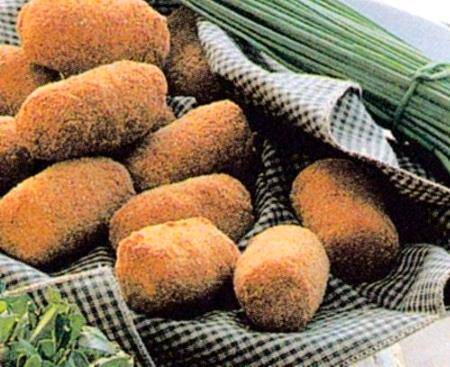 Kroketten achtereenvolgens door rest van bloem, losgeklopt ei en broodkruim rollen.