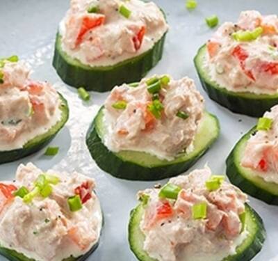 Schep voor het serveren de tonijnsalade op de komkommer.