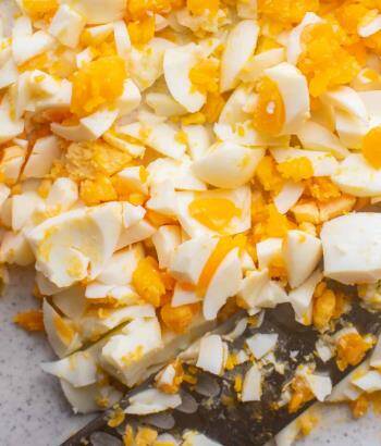 Laat de eieren schrikken, pel ze en prak ze fijn.